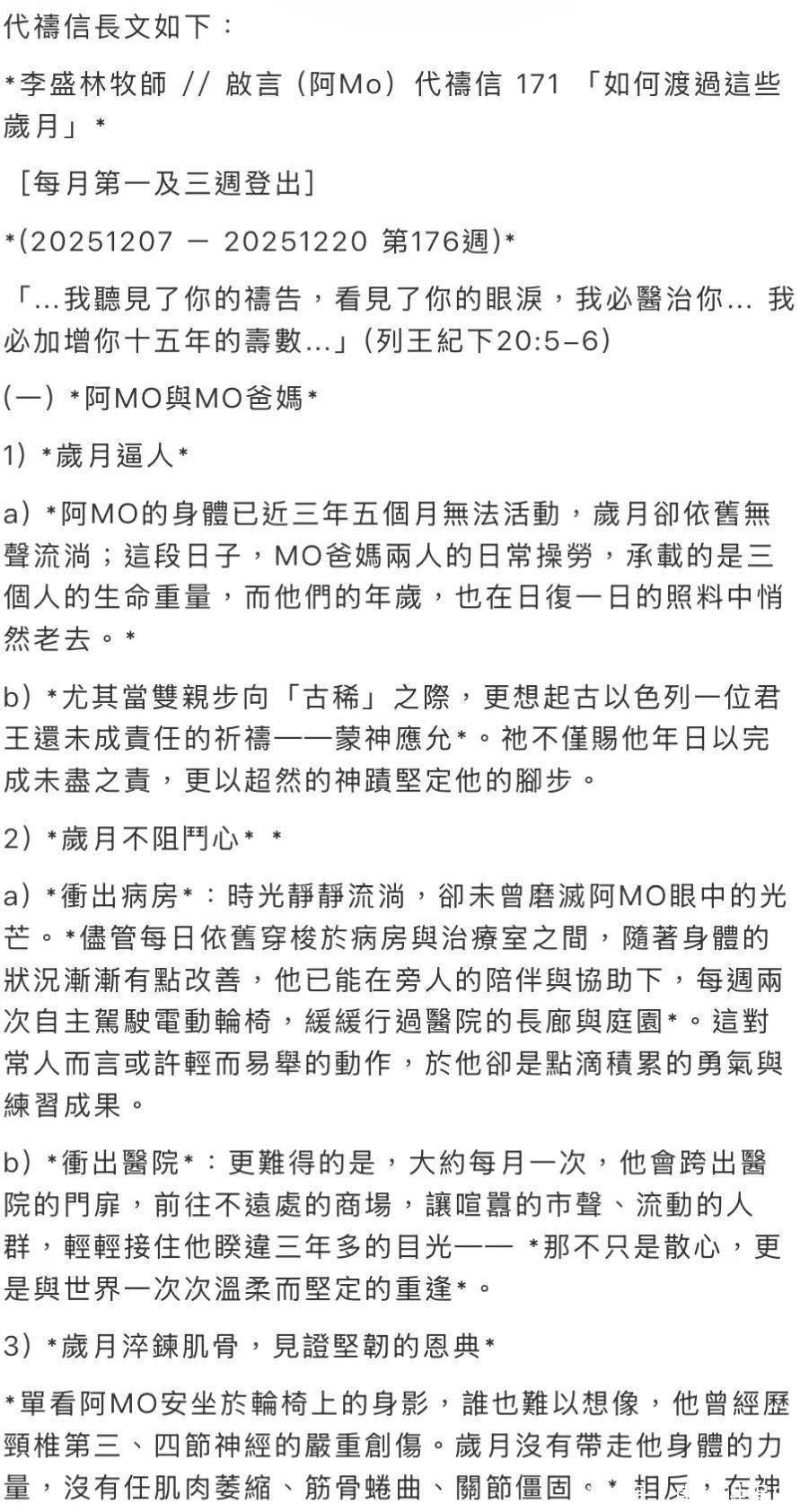 李盛林牧师写道,这些外出的时刻不只是散心,更是一种与世界温柔而坚定的再连接。网友纷纷留言表示,这段文字让人读到心酸,也让大家看到阿Mo惊人的生命韧性。代祷信已封 阿Mo父亲持续温柔纪录康复点滴自年意外发生以来,李盛林牧师一直透过代祷信向外界交代阿Mo的情况。从复健初期的困难,到每一个微小的进展,他都以温暖文字细腻记录。